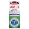Benylin Mucus Cough Night is a medicine which is used to help provide night time relief of coughing and related congestive symptoms and aid restful sleep. The liquid contains diphenhydramine which is an antihistamine that helps relieve coughing, dry secretions in the nose and chest, and helps you sleep, guaifenesin (an expectorant) to help loosen mucus (phlegm) from the lungs and make it easier to cough up, and levomenthol which helps you breathe more easily by relieving congestion.